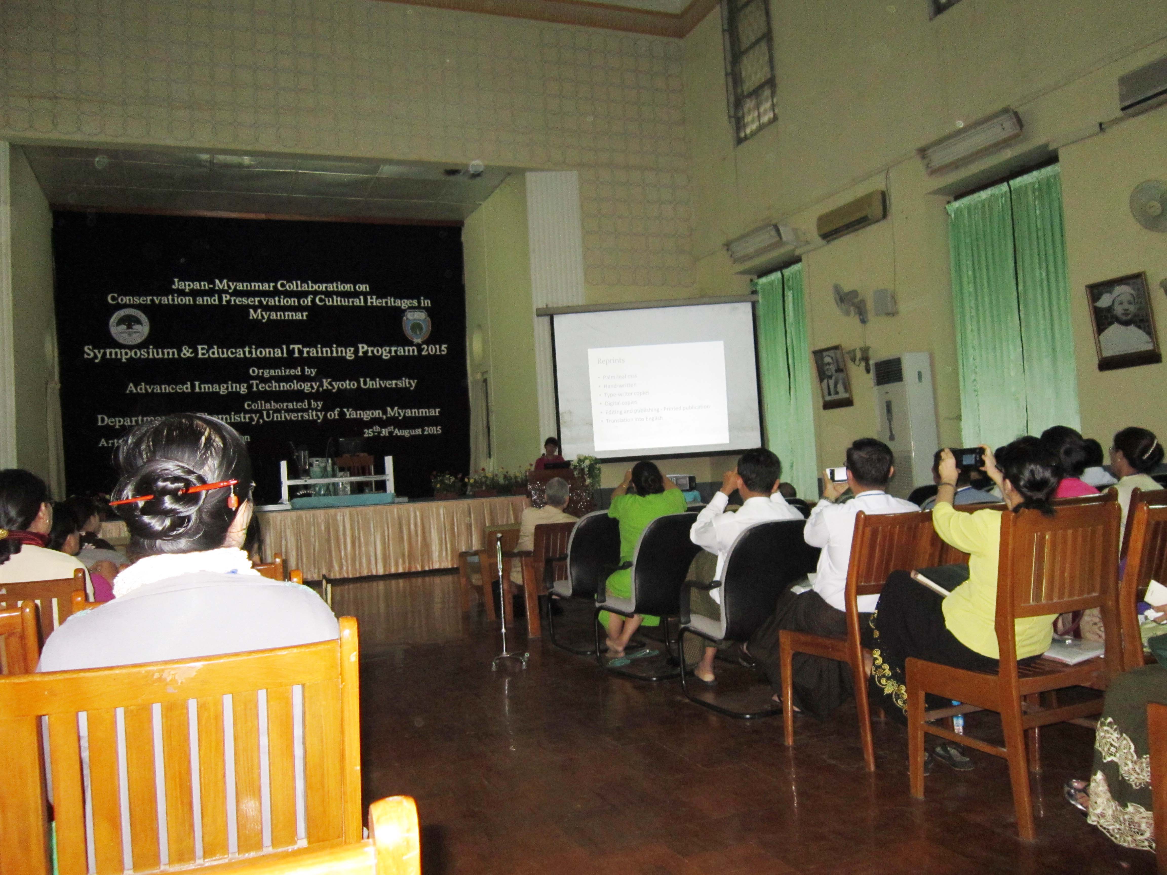 On 26th Wednesday, 2015, Presented on “Preservation and Digitization of Library Materials” by Daw Ni Ni Naing, Librarian, Universities’ Central Library at Japan- Myanmar Collaboration on Conservation and Preservation of Cultural Heritages in Myanmar, Symposium & Education Training Program 2015, Arts Hall, University of Yangon.